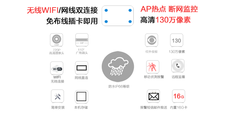 支持ONVIF 支持报警推送手机端 高清镜头,拍摄画面稳定 支持摄像头远程控制开关与开启摄像头 支持移动侦测报警,时刻关注家庭安全