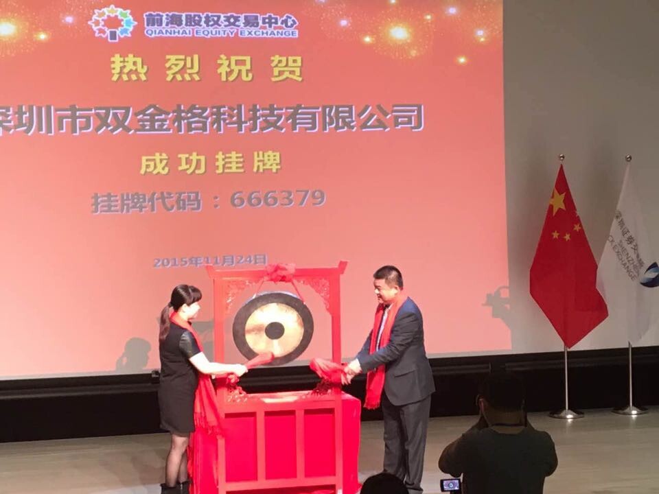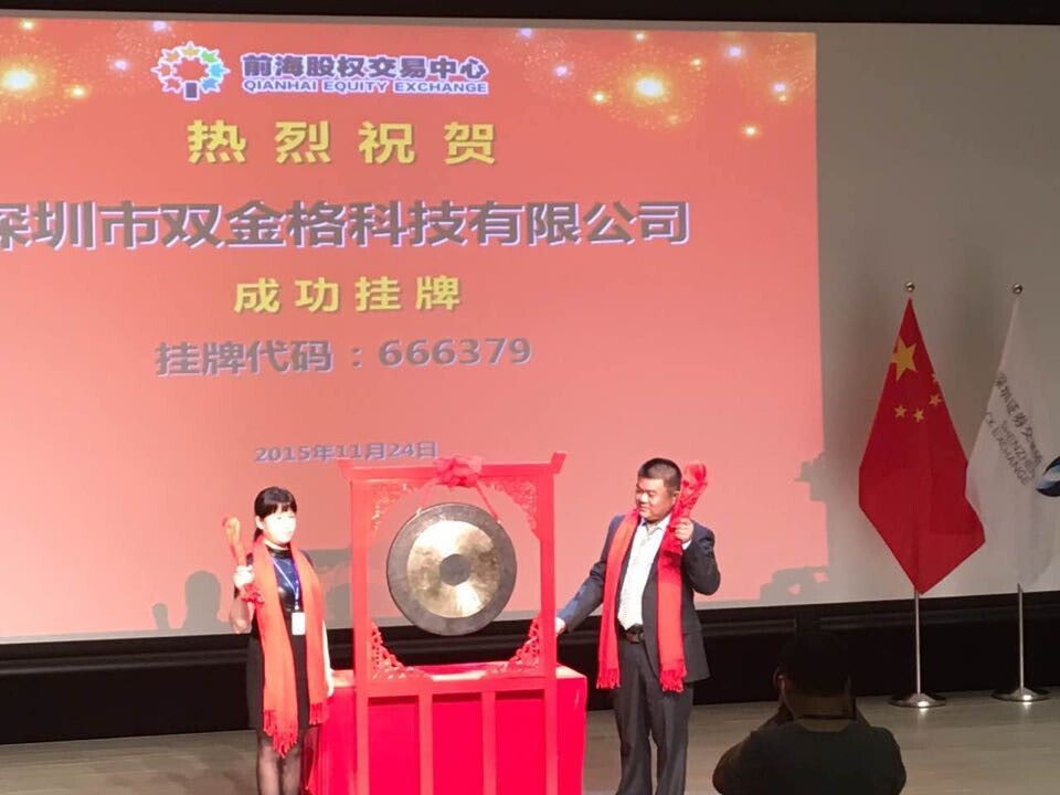 11月24日下午,深圳市双金格科技有限公司总经理吴崇强和副总经理张红妹在深圳证券交易所国际会议厅敲响了铜锣,宣告深圳市双金格科技有限公司正式在前海股权交易中心新四板上市,交易代码666379。